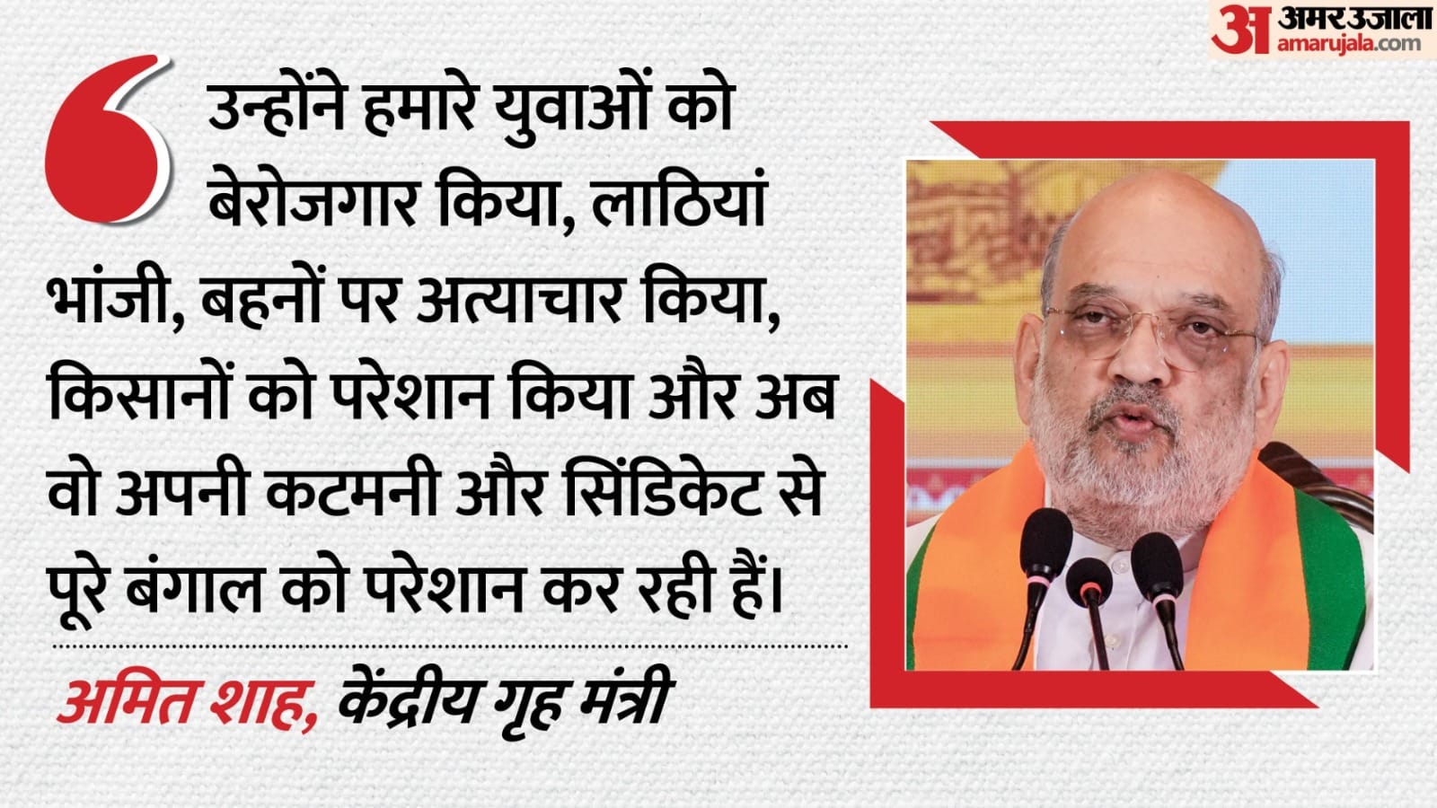 शाह ने सीएम ममता को आड़े हाथ लिया और कहा, 'उन्होंने हमारे युवाओं को बेरोजगार किया, लाठियां भांजी, बहनों पर अत्याचार किया, किसानों को परेशान किया और अब वो अपनी कटमनी और सिंडिकेट से पूरे बंगाल को परेशान कर रही हैं। अब आपको इस कटमनी और सिंडिकेट से मुक्ति पानी है, घुसपैठिया मुक्त बंगाल बनाना है। भाजपा चाहती है कि बंगाल को घुसपैठियों से मुक्त कर दें, लेकिन ममता बनर्जी इन्हें संभालकर रखना चाहती हैं। ममता दीदी, जितना जोर लगाना है, लगा दो, हम एक एक घुसपैठिये को चुन-चुनकर बंगाल से बाहर निकालेंगे।'