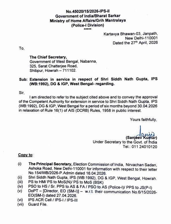 चुनाव आयोग ने कहा था कि अधिकारियों को हटाने का फैसला राज्य में चुनाव तैयारियों की समीक्षा के बाद लिया गया था। सोमवार को जारी आदेश में कहा गया कि कैबिनेट की नियुक्ति समिति ने गृह मंत्रालय के प्रस्ताव को मंजूरी दे दी है, जिसके तहत सार्वजनिक हित में नियमों में ढील देकर सिद्ध नाथ गुप्ता की सेवा 30 अप्रैल 2026 के बाद छह महीने के लिए बढ़ाई गई है।