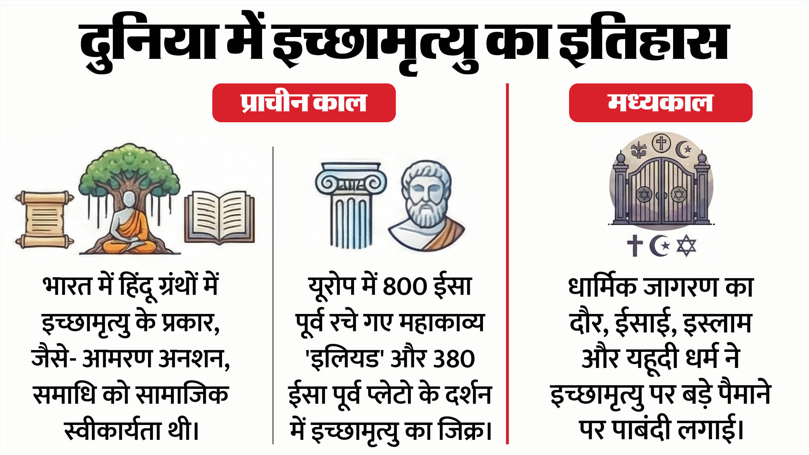 प्राचीन कालप्राचीन काल में मृत्यु को चिकित्सा के बजाय सामाजिक दृष्टिकोण से देखा जाता था। होमर के प्रसिद्ध महाकाव्य 'इलियड', जो कि लगभग 8वीं सदी ईसा पूर्व में रचा गया था, इसमें घायल योद्धाओं के दर्द को खत्म करने के लिए दया मृत्यु या इच्छा मृत्यु मांगने का जिक्र मिलता है।