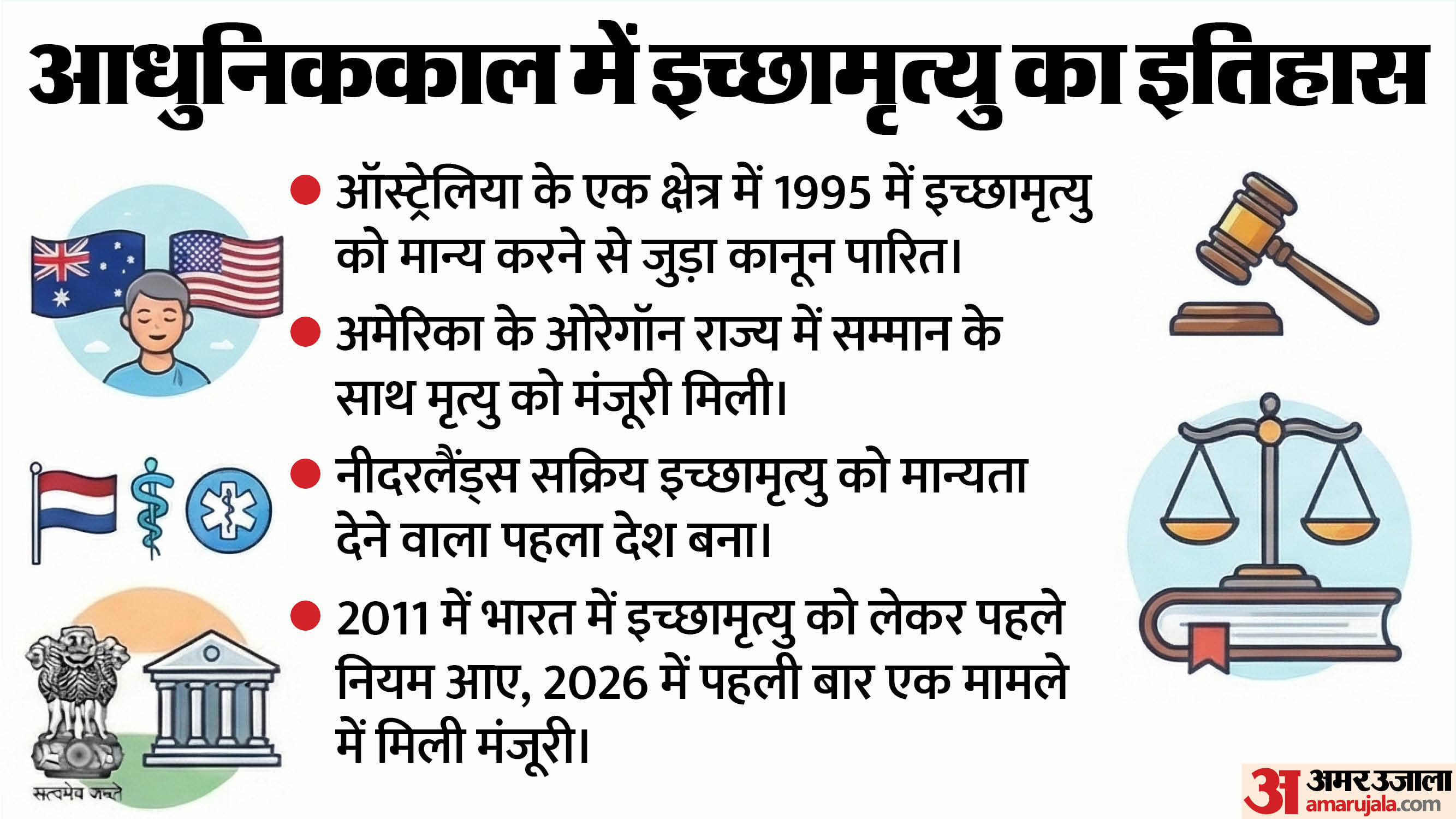 - अमेरिका के ओरेगन राज्य ने 1997 में ही डेथ विद डिग्निटी एक्ट लागू कर दिया था। 2026 की स्थिति के अनुसार, अमेरिका के कुछ क्षेत्रों में यह मॉडल मान्य है, जबकि 40 राज्यों में इस पर सख्त प्रतिबंध है।