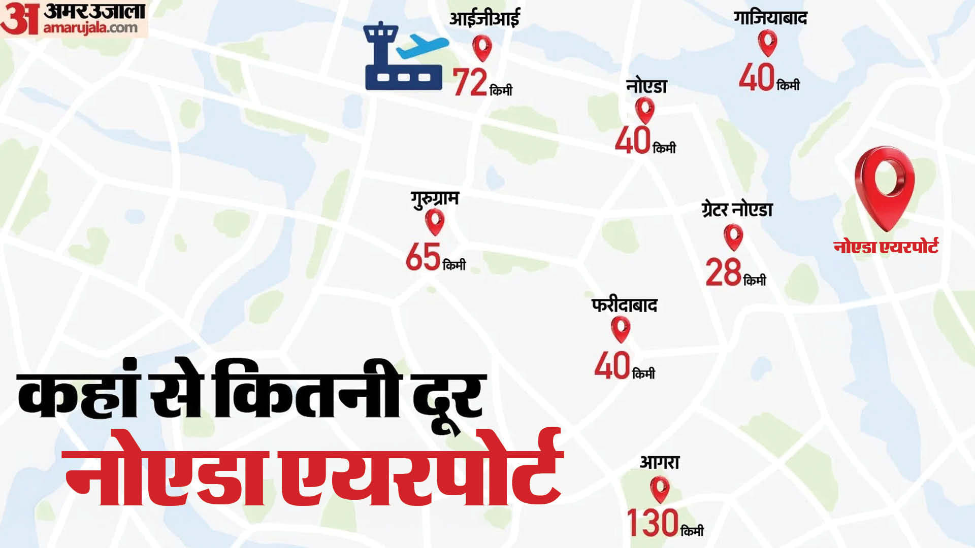 इस हवाई अड्डे के बनने से इंदिरा गांधी अंतरराष्ट्रीय हवाईअड्डे (आईजीआई) पर दबाव कम होगा। यह हवाई अड्डा आईजीआई से लगभग 72 किमी, नोएडा, फरीदाबाद और गाजियाबाद से लगभग 40 किमी, ग्रेटर नोएडा से 28 किमी, गुरुग्राम से 65 किमी और आगरा से 130 किमी की दूरी पर है।