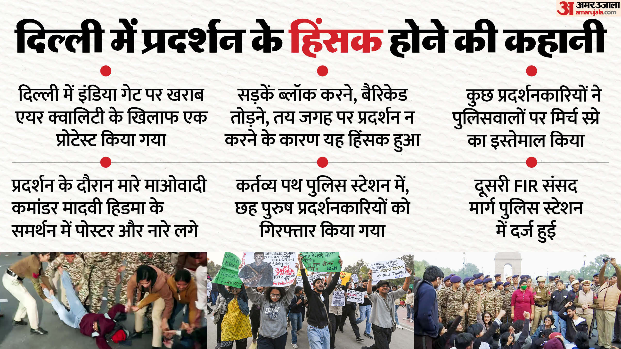 दिल्ली के इंडिया गेट पर प्रदूषण के खिलाफ प्रदर्शन के दौरान पुलिस पर मिर्ची स्प्रे छिड़का गया। दिल्ली पुलिस ने दो थानों में एफआईआर दर्ज की है। पुलिस ने 22 प्रदर्शनकारियों को गिरफ्तार किया गया है। एफआईआर दर्ज होने से पहले पुलिस ने 15 लोगों को हिरासत में लिया। इसी दौरान प्रदर्शनकारियों ने कुछ माओवादी नेताओं के समर्थन में नारे भी लगाए। इसमें से एक हाल में ही मारे गए खूंखार नक्सली हिड़मा का भी नाम शामिल था। हिड़मा को पर्यावरण के प्रति संघर्ष करने वाला बताया गया।