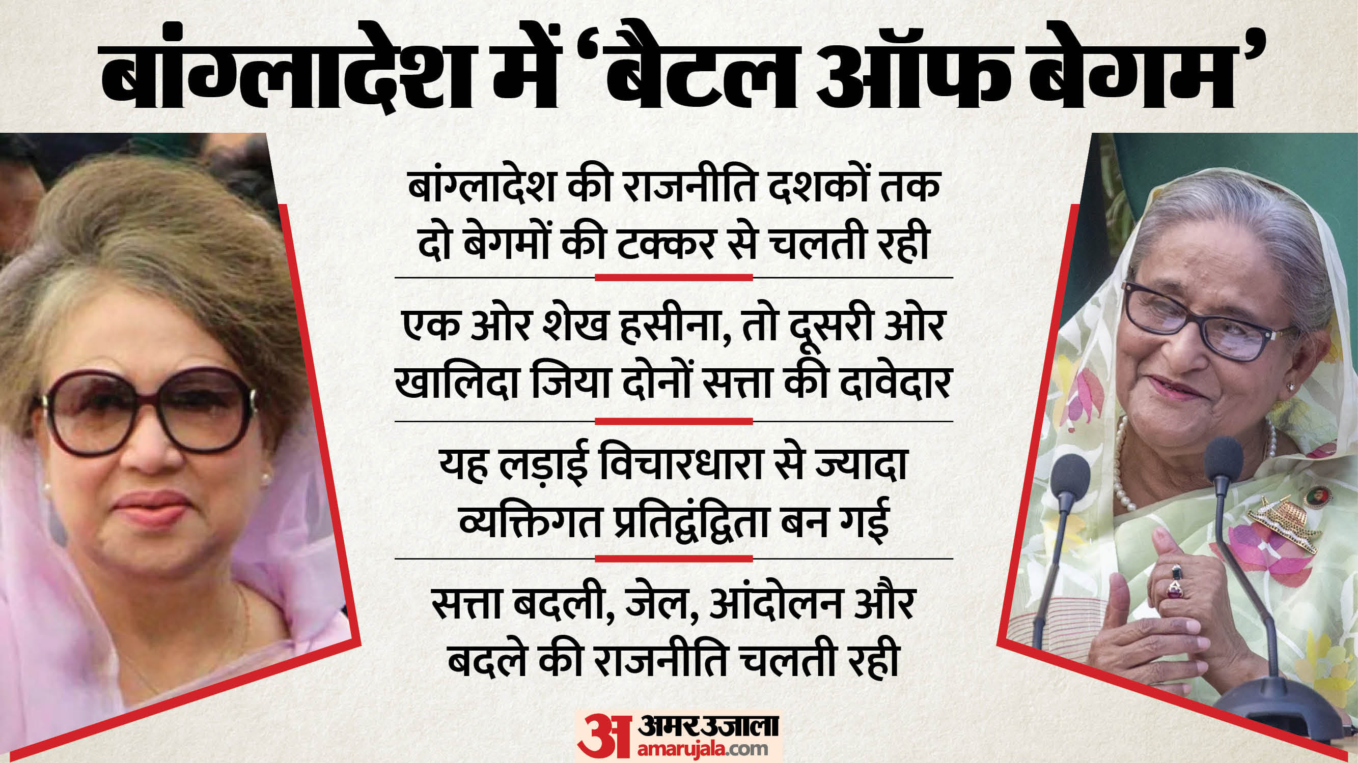 1991 से खालिदा और हसीना का ही सत्ता पर कब्जा रहा। इनकी लड़ाई को बांग्लादेश में बैटल ऑफ बेगम के नाम से जाना जाता है। दोनों महिलाएं राजनीतिक राजवंशों की नेता थीं। तीन दशक से अधिक समय तक बारी-बारी से दोनों ने सत्ता संभाली है।