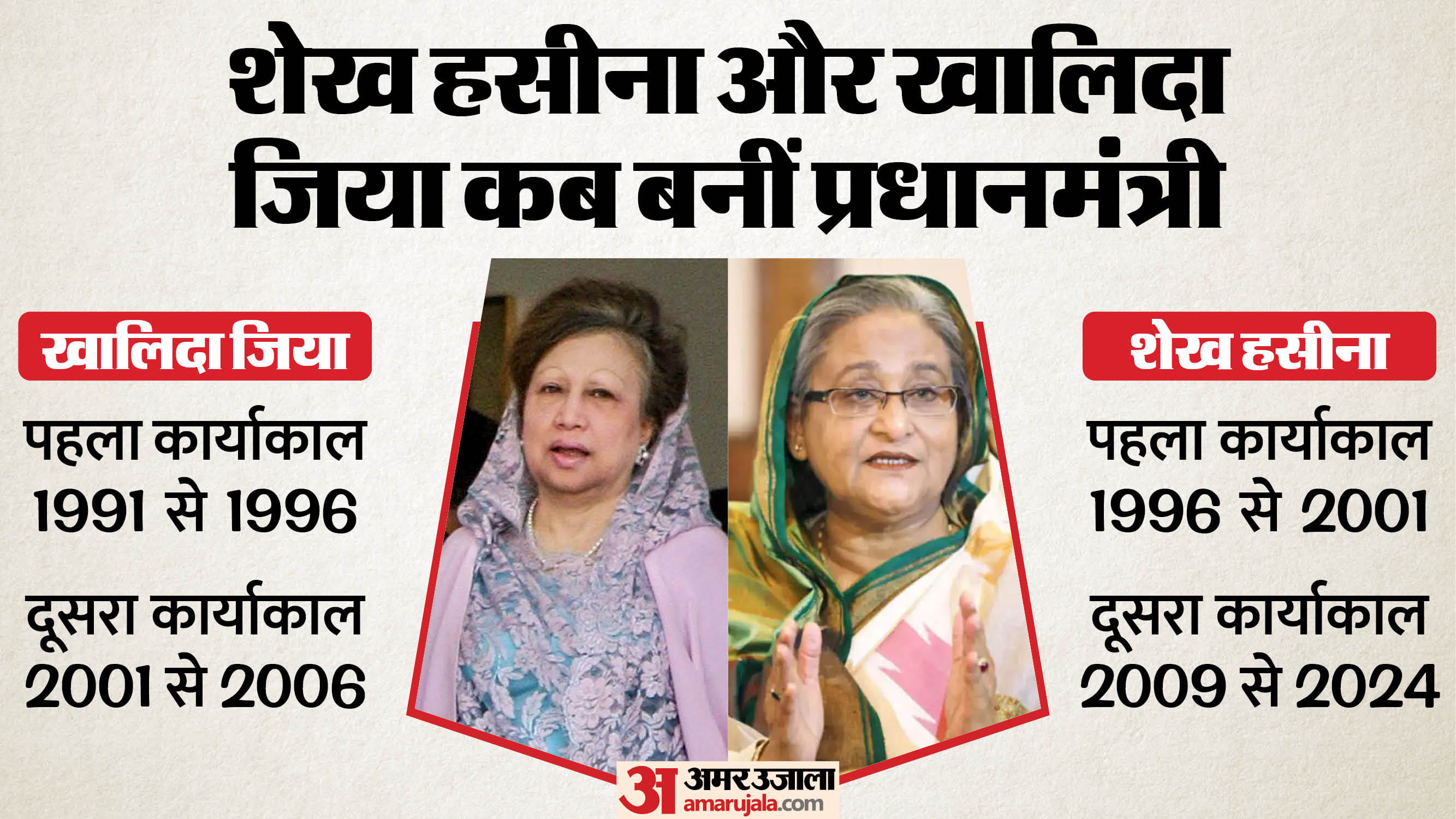 शेख हसीना 1996 में पहली बार प्रधानमंत्री बनीं। सत्ता में आने के बाद उन्होंने सबसे पहले बीएनपी के द्वारा लाए गए ऑर्डिनेंस को हटाया। 2009 में हसीना एक बार फिर सत्ता में आईं और बीएनपी के खिलाफ और अधिक आक्रमक रुख अपनाया। 2018 में खालिदा को भ्रष्टाचार के आरोप में 17 साल की सजा हुई। 2009 में वापसी के बाद हसीना लगातार 15 वर्षों तक सत्ता में बनी रही।