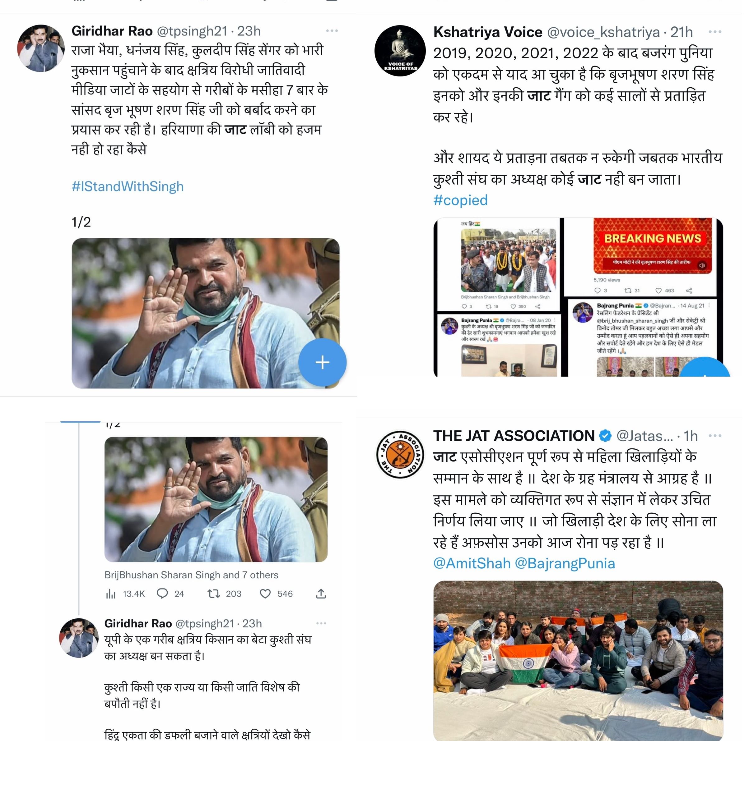 ट्विटर पर क्षत्रिय वॉयस नाम के एक हैंडल से ट्वीट किया गया है। इसमें लिखा है कि 2019, 2020, 2021 और 2022 के बाद बजरंग पुनिया को एकदम से याद आ चुका है कि बृजभूषण शरण सिंह, इनको और इनकी जाट गैंग को कई सालों से प्रताड़ित कर रहे। और शायद ये प्रताड़ना तब तक न रुकेगी, जब तक भारतीय कुश्ती संघ का अध्यक्ष कोई जाट नहीं बन जाता। इन ट्वीट में बृजभूषण शरण सिंह और पहलवान बजरंग पुनिया के एक साथ फोटो वाले कई ट्वीट एड किए गए हैं। ये ट्वीट पुनिया द्वारा किए गए थे। इन ट्वीट में बजरंग ने बृजभूषण शरण सिंह के प्रति सम्मानजनक शब्दों का इस्तेमाल किया है।