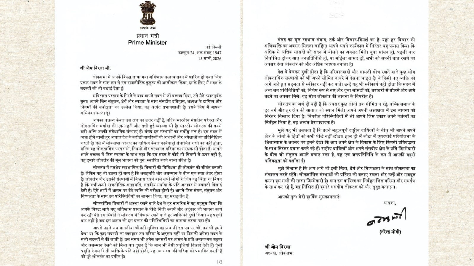 वहीं, अब लोकसभा अध्यक्ष ओम बिरला की तरफ से प्रधानमंत्री नरेंद्र मोदी का उनके पत्र के लिए आभार जताया गया है। सोशल मीडिया एक्स पर एक पोस्ट में ओम बिरला ने लिखा- माननीय प्रधानमंत्री श्री नरेंद्र मोदी जी, आपका पत्र प्राप्त हुआ। भारत के संसदीय लोकतंत्र के नियमों, प्रक्रियाओं और परंपराओं के प्रति आपका हमेशा अटूट विश्वास रहा है। आपका पत्र लोक सेवा के उन उच्चतम नैतिक मूल्यों को व्यक्त करता है, जिन्हें आपने अपने दीर्घ सार्वजनिक जीवन में जिया है; वर्तमान में भारत के प्रधानमंत्री के रूप में तथा इससे पूर्व गुजरात के मुख्यमंत्री के रूप में। आप सदैव संसद की मूल प्रकृति - संवाद, तर्क और विचार-विमर्श में गहरा विश्वास रखते हैं। आप संसद में उठने वाली प्रत्येक आवाज को लाखों भारतीय नागरिकों की आवाज के रूप में सम्मान देते हैं। आप हमेशा संसदीय कार्यों को सर्वोच्च प्राथमिकता देते हैं और संसद में उठाए गए प्रत्येक मुद्दे का समाधान निकालने का प्रयास करते हैं। आपका यह संदेश दलगत सीमाओं से ऊपर उठकर संसद, राज्य विधानमंडल तथा स्थानीय निकायों के सभी जनप्रतिनिधियों को प्रेरित करेगा और हमारे स्वतंत्रता सेनानियों तथा संविधान सभा के सदस्यों द्वारा स्थापित लोकतंत्र के सशक्त नैतिक आधार को और सुदृढ़ करेगा। आपके प्रेरणादायी शब्दों के लिए हार्दिक आभार।