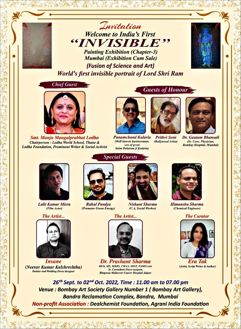 आजादी के अमृत महोत्सव के उपलक्ष्य में मुंबई में पहली बार आयोजित की जाने वाले अदृश्य चित्रों की इस प्रदर्शनी में जितने भी चित्र दिखाए जाएंगे, वे अदृश्य हैं। यानि दिन की रोशनी में नहीं दिखते हैं। इन्हें देखने के लिए कला दीर्घा की लाइटें बंद की जाती हैं, उसके बाद एक विशिष्ट रोशनी से इन चित्रों को जीवंत किया जाता है। डॉक्टर प्रशांत शर्मा जयपुर के भगवान महावीर कैंसर अस्पताल में कैंसर रोग विशेषज्ञ हैं। बचपन से ही उन्हें चित्रकारी का और बांसुरी वादन का शौक है। दूसरे कलाकार नीरव कुलश्रेष्ठ सृजन के क्षेत्र में इनसेन के नाम से जाने जाते हैं।