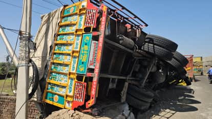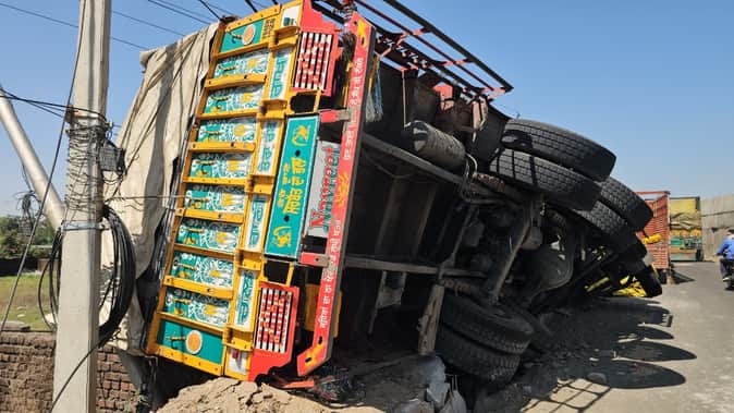 राष्ट्रीय राजमार्ग पर खरोट मोड़ के पास पलटा ट्रक। संवाद