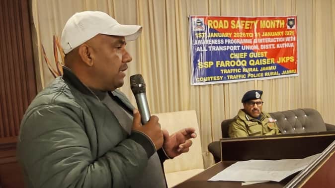 एसएसपी ट्रैफिक रूरल कठुआ में ट्रांसपोर्टरों के साथ आयोजित एक जागरूकता बैठक में पहुंचे थे।