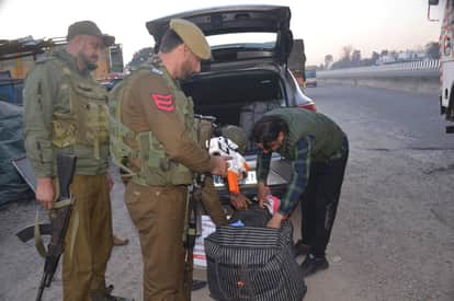 जम्मू पठानकोट नेशनल हाईवे पर वाहनों की जांच करती पुलिस टीम