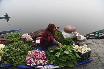 श्रीनगर में एक सर्द सुबह डल किनारे सब्जी विक्रेता। संवाद