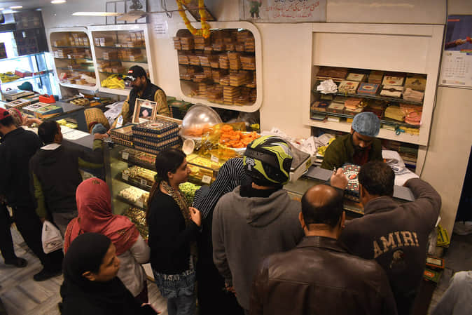 श्रीनगर के बाजार में बेकरी की दुकान पर खरीदारी करते लोग। संवाद