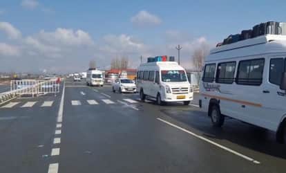 जम्मू-कश्मीर हाईवे खुलने के बाद कुलगाम के काजीगुंड से गुजरते वाहन। संवाद