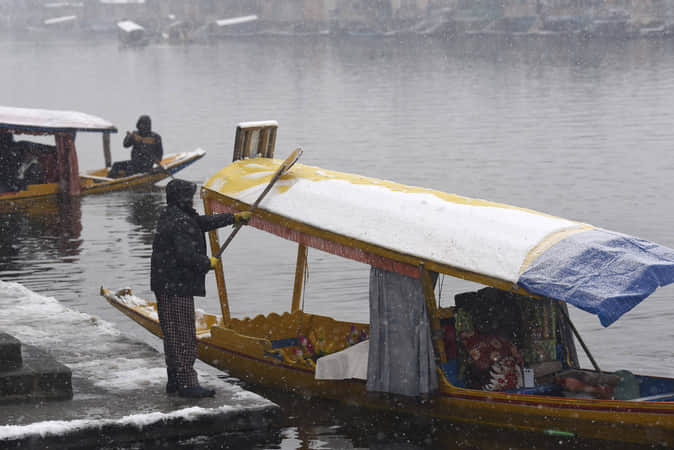 श्रीनगर में मंगलवार को हुई बर्फबारी के दौरान डल में शिकारे। बासित जरगर