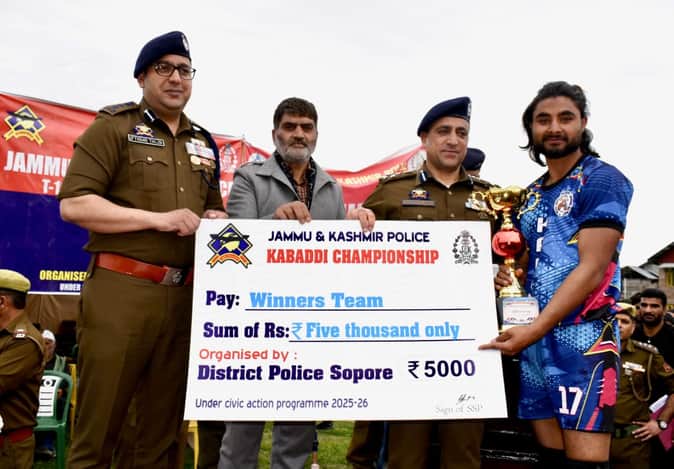 सोपोर। पुलिस ने शनिवार को सिविक एक्शन प्रोग्राम 2025-26 के अंतर्गत खेलकूद गतिविधियों का ग्रैंड फिनाले आयोजित किया। इस अवसर पर नॉर्थ कश्मीर रेंज के डीआईजी मकसूद-उल-जमान मुख्य अतिथि के रूप में शामिल हुए।