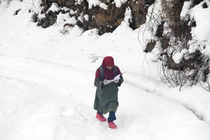 श्रीनगर के बाहरी इलाके फकीर गुजरी में घर के बाहर जमी बर्फ में पढ़ती एक बच्ची। बासित जरगर