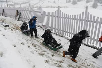 बर्फबारी के बाद गुलमर्ग में पर्यटक। संवाद