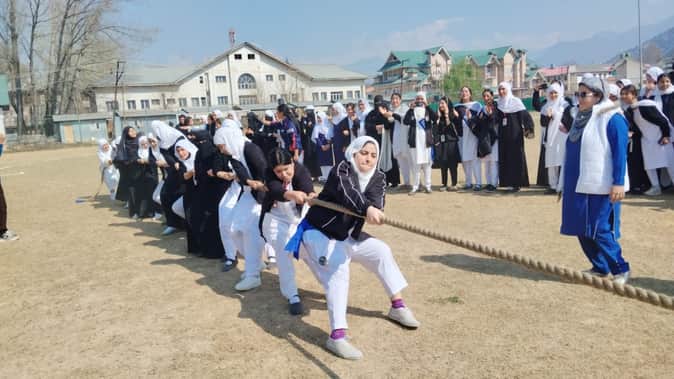 श्रीनगर के राजबाग स्थित गिंदन स्टेडियम में आयोजित रस्साकशी प्रतियोगिता में दम दिखातीं छात्राएं