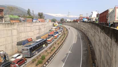 हाइवे बंद होने पर जखैनी इलाके में राजमार्ग पर लगी वाहनों की कतार।