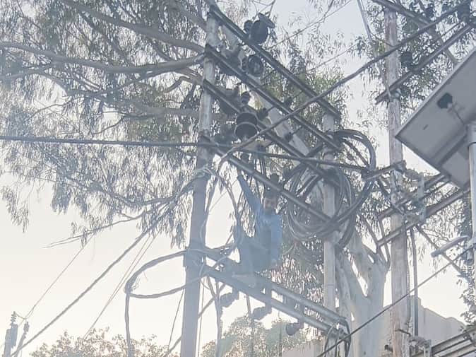बिजली ढांचे को हुए नुकसान की मरम्मत करते बिजली विभाग के कर्मचारी