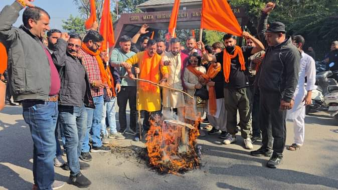 कटड़ा। श्री माता वैष्णो देवी विश्वविद्यालय में मेडिकल कॉलेज में एमबीबीएस सीटों के आवंटन को लेकर युवा राजपूत सभा, विश्व हिंदू परिषद, शिवसेना और मूवमेंट कल्कि ने प्रदर्शन किया।