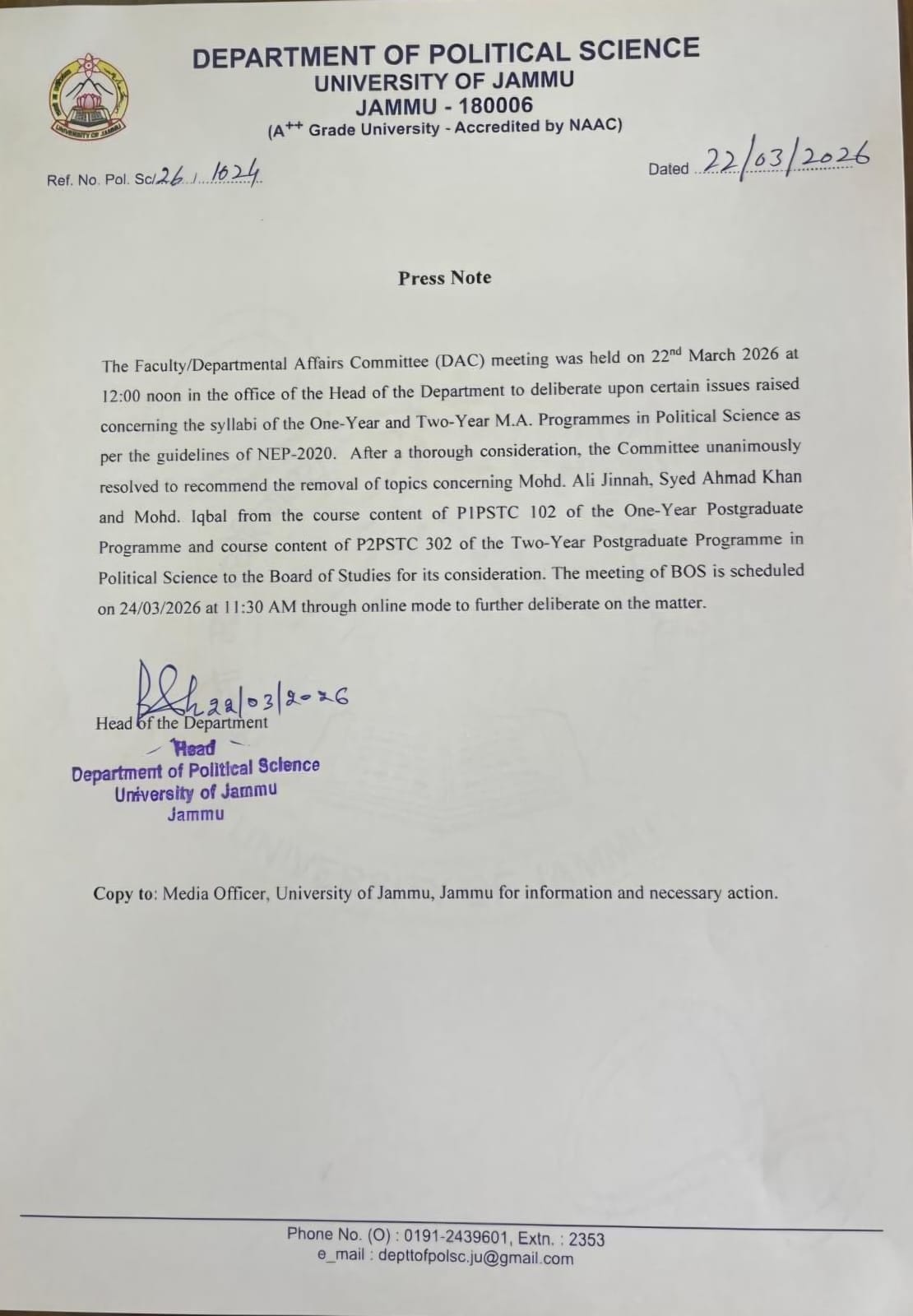 जम्मू यूनिवर्सिटी में सिलेबस को लेकर चल विवाद के बीच पॉलिटिकल साइंस विभाग ने मोहम्मद अली जिन्ना से जुड़े विषयों को हटाने की एकमत से सिफारिश की है। यह फैसला रविवार को विभाग की बैठक में लिया गया। अब इस प्रस्ताव पर अंतिम निर्णय 24 मार्च को होने वाली बोर्ड की ऑनलाइन बैठक में लिया जाएगा।