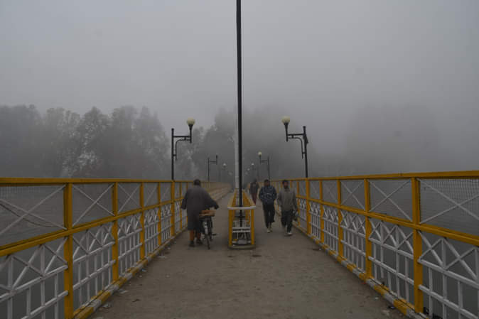 श्रीनगर में सर्दी की सुबह कोहरे के बीच झेलम के पैदल पुल पर लोग। बासित जरगर