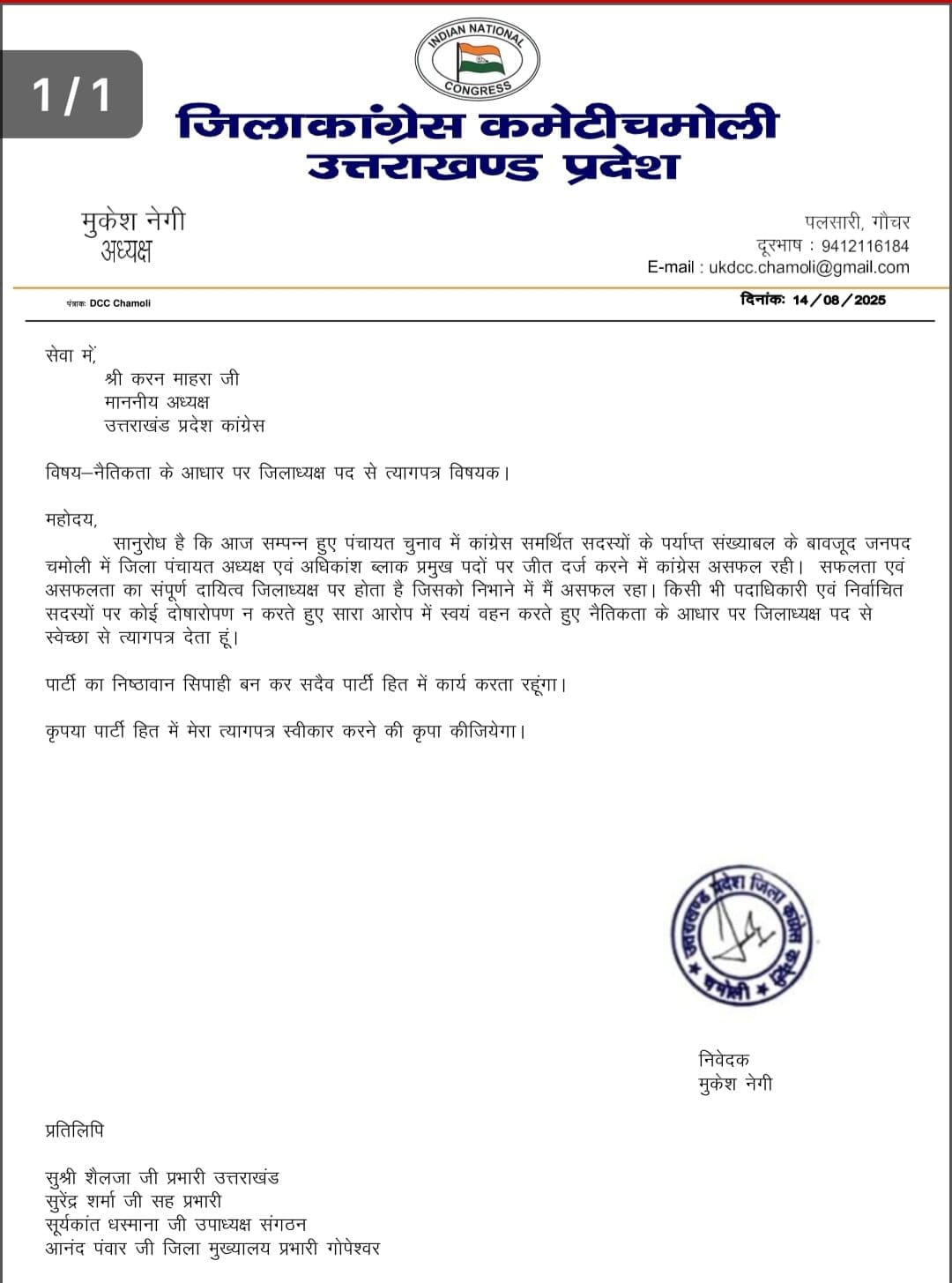 चमोली में कांग्रेस जिलाध्यक्ष मुकेश नेगी ने दिया त्यागपत्र