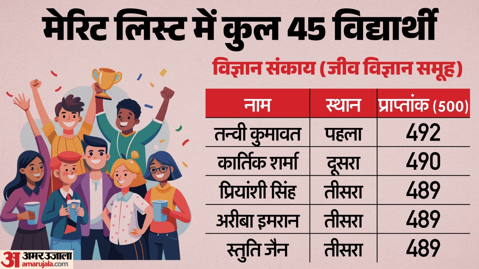 12वीं के विज्ञान संकाय (जीव विज्ञान समूह) की मेरिट लिस्ट में कुल 45 विद्यार्थियों ने स्थान प्राप्त किया, जिसमें पहले स्थान पर 1 छात्र, दूसरे स्थान पर 1 छात्र और तीसरे स्थान पर 3 छात्र शामिल रहे।