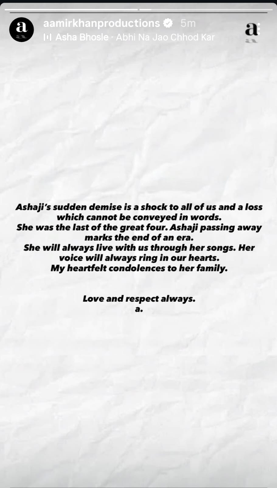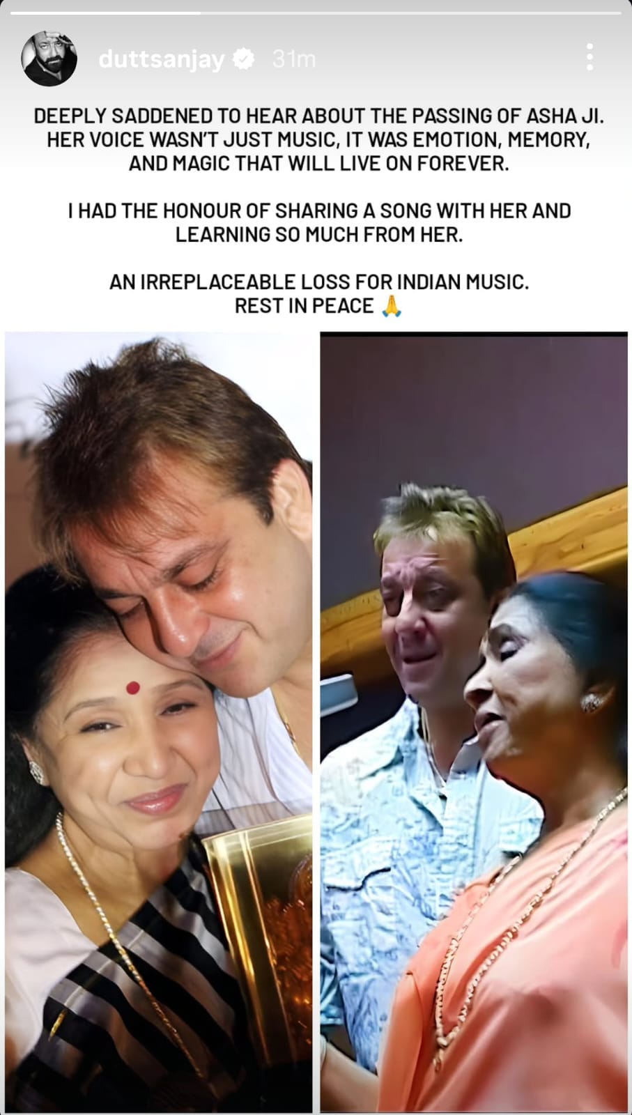 आशा भोसले के निधन पर अभिनेता संजय दत्त भी गमगीन हैं। इंस्टाग्राम पर एक पोस्ट साझा करते हुए उन्होंने आशा भोसले और उनकी संगीत यात्रा को याद किया है।03:48 PM, 12-Apr-2026