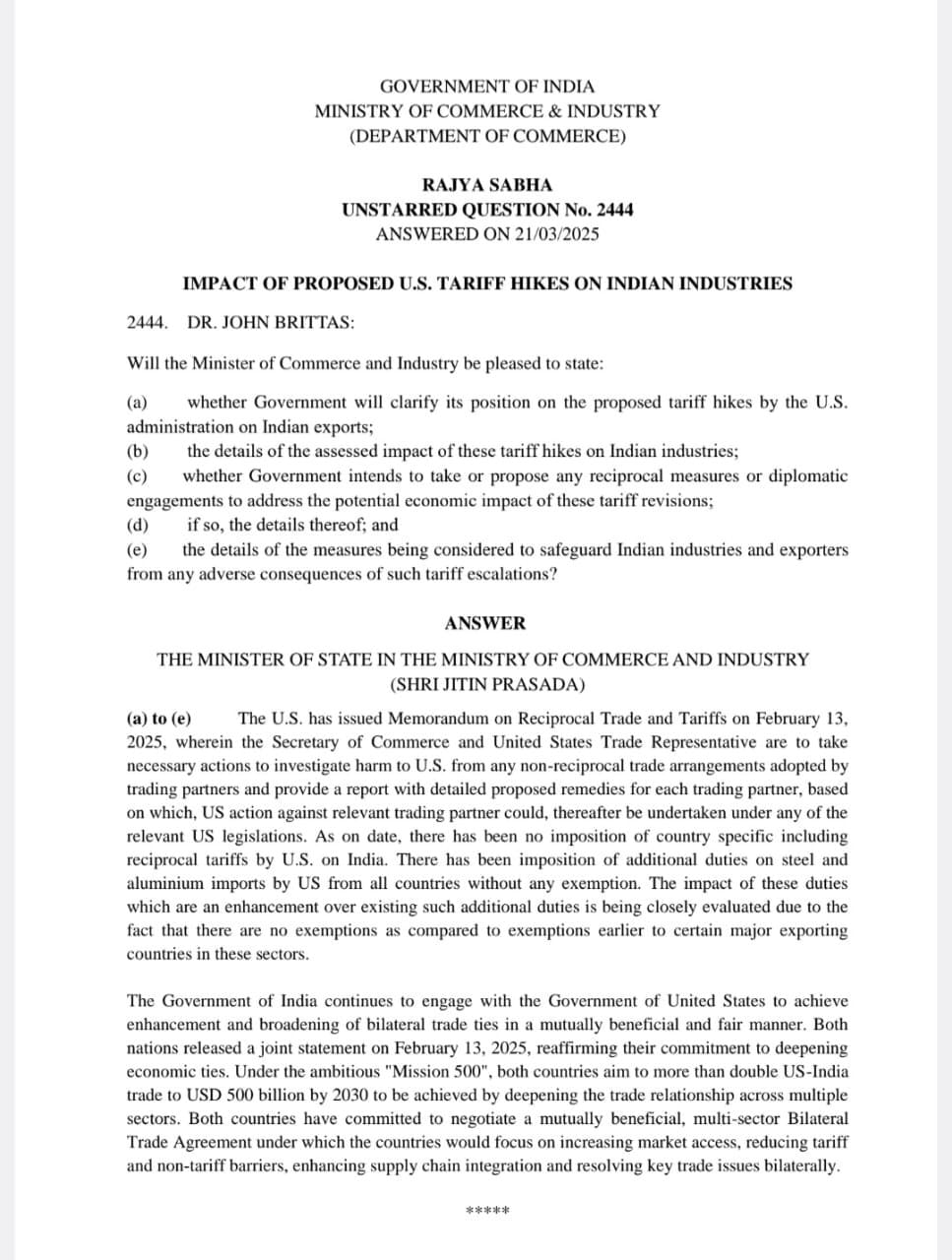 वाणिज्य और उद्योग राज्य मंत्री जितिन प्रसाद ने राज्य सभा में एक लिखित उत्तर में बताया कि, संयुक्त राज्य अमेरिका ने 13 फरवरी, 2025 को पारस्परिक व्यापार और शुल्कों पर एक ज्ञापन जारी किया है, जिसमें वाणिज्य सचिव और संयुक्त राज्य व्यापार प्रतिनिधि को व्यापारिक साझेदारों की तरफ से अपनाई गई किसी भी गैर-पारस्परिक व्यापार व्यवस्था से अमेरिका को होने वाले नुकसान की जांच करने के लिए आवश्यक कार्रवाई करनी है और प्रत्येक व्यापारिक साझेदार के लिए विस्तृत प्रस्तावित उपायों के साथ एक रिपोर्ट प्रदान करनी है, जिसके आधार पर, संबंधित व्यापारिक साझेदार के खिलाफ अमेरिका की कार्रवाई किसी भी प्रासंगिक अमेरिकी कानून के तहत की जा सकती है। आज की तारीख तक, अमेरिका की तरफ से भारत पर पारस्परिक शुल्कों समेत देश-विशिष्ट का कोई अधिरोपण नहीं किया गया है। अमेरिका की तरफ से बिना किसी छूट के सभी देशों से स्टील और एल्यूमीनियम आयात पर अतिरिक्त शुल्क लगाया गया है। इन शुल्कों के प्रभाव, जो मौजूदा अतिरिक्त शुल्कों पर एक बढ़ोतरी है, का बारीकी से मूल्यांकन किया जा रहा है क्योंकि इन क्षेत्रों में कुछ प्रमुख निर्यातक देशों को पहले की छूट की तुलना में कोई छूट नहीं है।'गृह मंत्रालय बहुत कठिन परिस्थितियों में काम करता है'