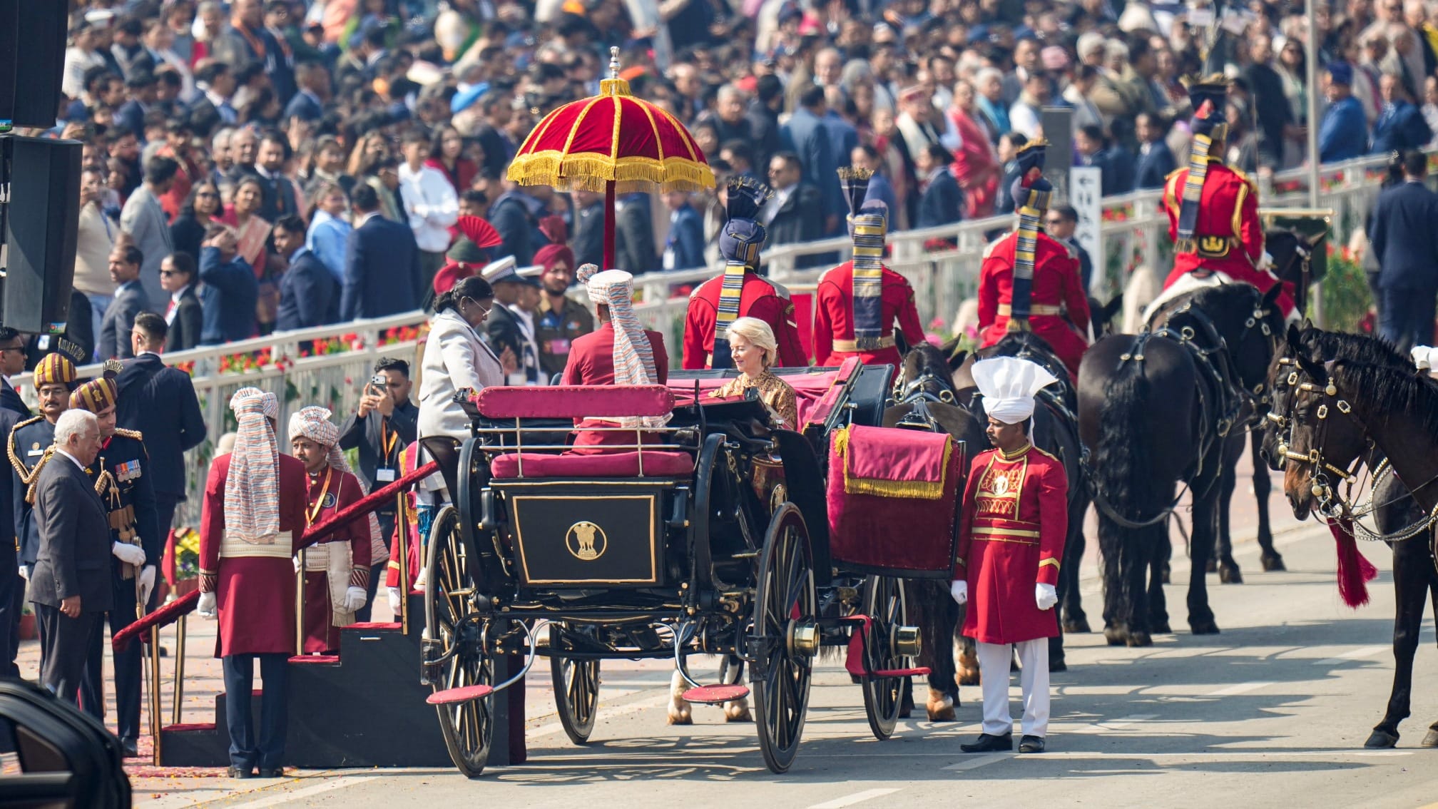 77th #RepublicDay🇮🇳 Parade | President Droupadi Murmu, along with President of the European Council, António Luís Santos da Costa and President of the European Commission, Ursula Von Der Leyen, leaves for Rashtrapati Bhavan from the Kartavya Path after witnessing the parade… pic.twitter.com/qK3YvPFKd1