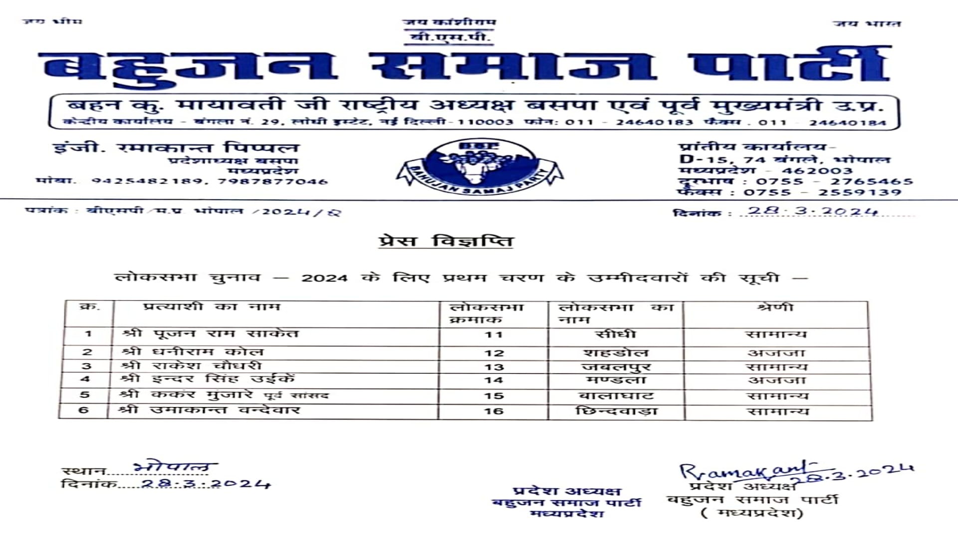 लोकसभा चुनाव के लिए गुरुवार को बहुजन समाज पार्टी (BSP) ने मध्यप्रदेश की छह सीटों पर प्रत्याशियों की घोषणा कर दी है। इसमें लोकसभा की जबलपुर, मंडला, बालाघाट, सीधी, शहडोल और छिंदवाड़ा सीट शामिल हैं। बसपा ने लिस्ट में सीधी से पूजनराम साकेत, शहडोल से धनीराम कोल, जबलपुर से राकेश चौधरी, मंडला से इंदिर सिंह उईके, बालाघाट से कंकर मुंजारे और छिंदवाड़ा से उमाकांत वन्देवार को चुनावी मैदान में उतारा है।