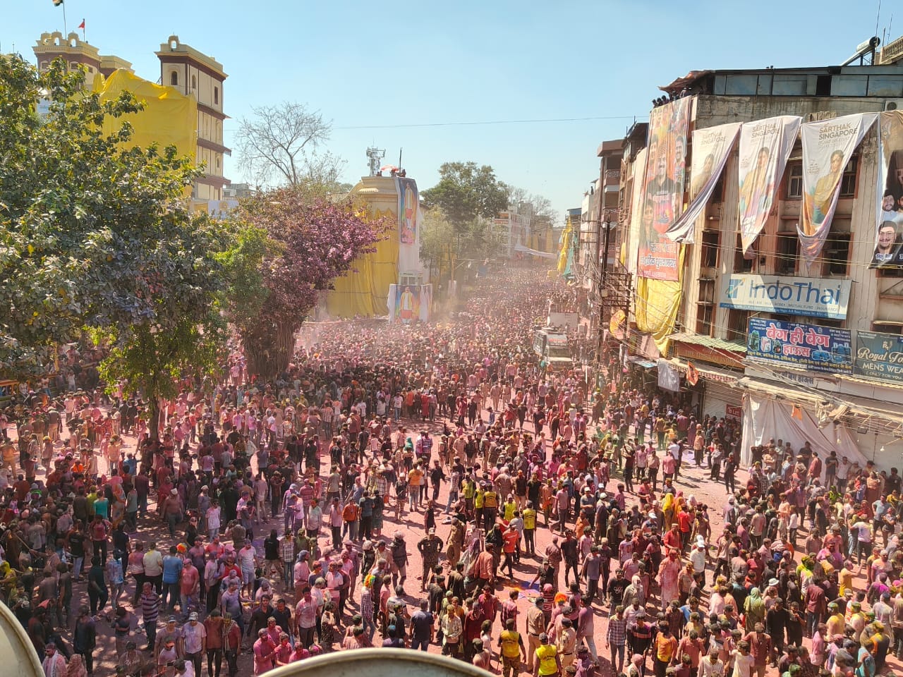 संगम कॉर्नर की गेर में भगवान कृष्ण की झांकी के पीछे मोर पंखे सजाए गए थे। मोर पंखों से रंगों की बौछार हो रही थी। इस झांकी ने लोगों का मन मोह लिया। कृष्ण और मोर पंख और रास उल्लास का अद्भुत नाता है, जो इस झांकी ने जीवंत कर दिया।