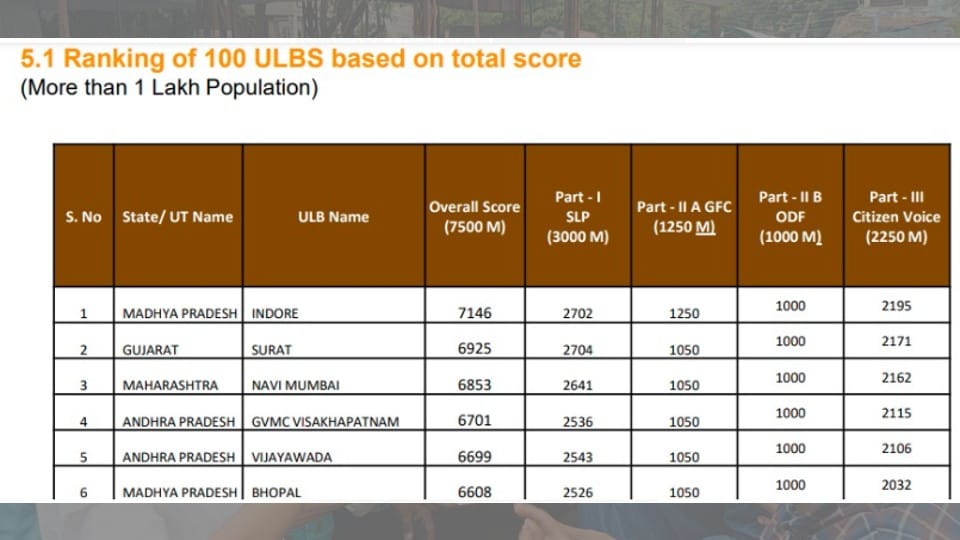 भोपाल को एक लाख से अधिक आबादी वाले शहर में 6वां स्थान मिला है।