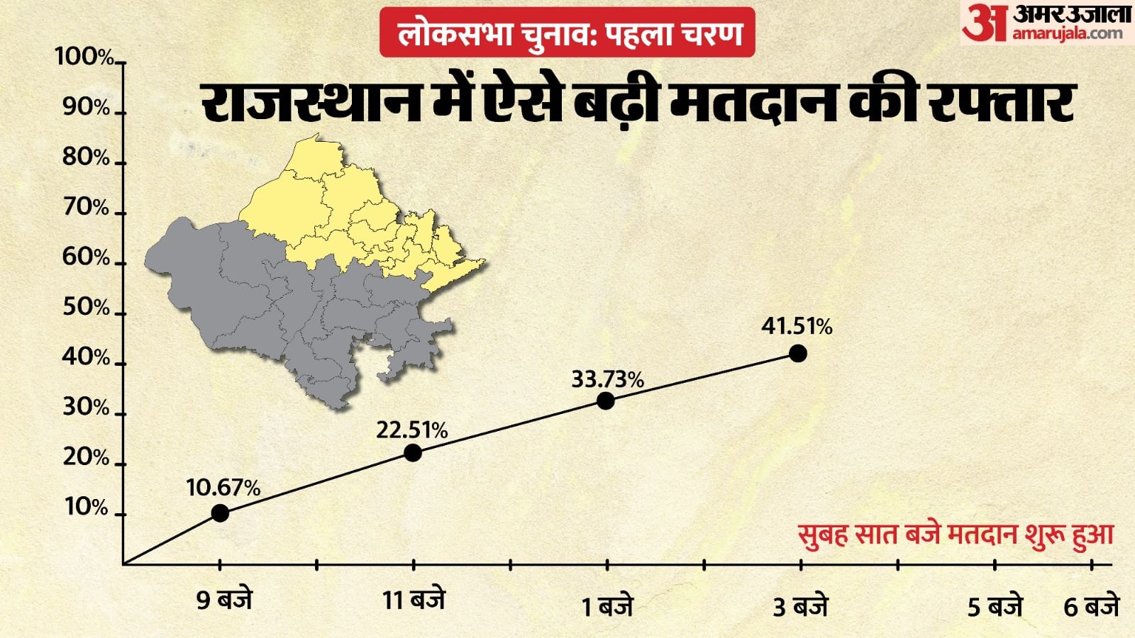 प्रदेश में सुबह 11 बजे से दोपहर तीन बजे तक मतदान का प्रतिशत लगातार चढ़ता रहा। पहले चरण का मतदान शाम छह बजे तक होना है। दोपहर तीन बजे तक 41.51 प्रतिशत मतदान हुआ है। सबसे ज्यादा मतदान 50.14 प्रतिशत के साथ गंगानगर अब भी टॉप पर है, जबकि करौली-धौलपुर सीट सबसे कम 33.86 प्रतिशत मतदान के साथ सबसे पीछे चल रही है।