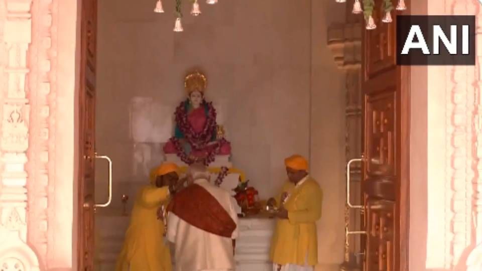 #WATCH | Ayodhya Dhwajarohan | Prime Minister Narendra Modi, along with CM Yogi Adityanath and UP Governor Anandiben Patel, offers prayers at Mata Annapurna Mandir ahead of the historic flag hoisting at Shri Ram Janmabhoomi Mandir