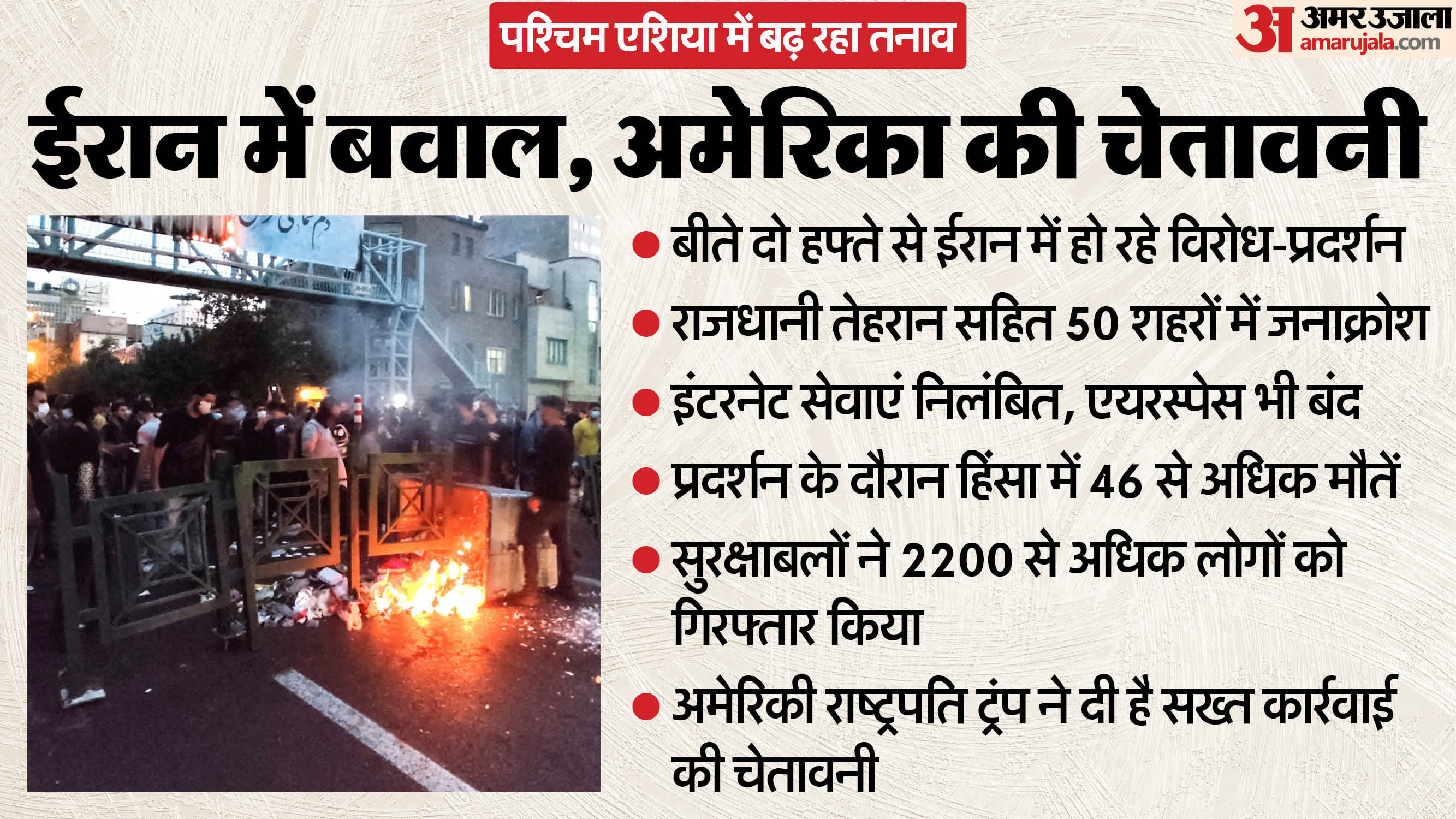 ईरान में बीते दो हफ्तों से लगातार विरोध प्रदर्शन जारी है। बढ़ती महंगाई और गिरती मुद्रा को लेकर जनता का आक्रोश फैल गया, जिसके बाद ईरान सरकार के खिलाफ लोगों ने सड़कों पर उतरकर प्रदर्शन करना शुरू कर दिया।