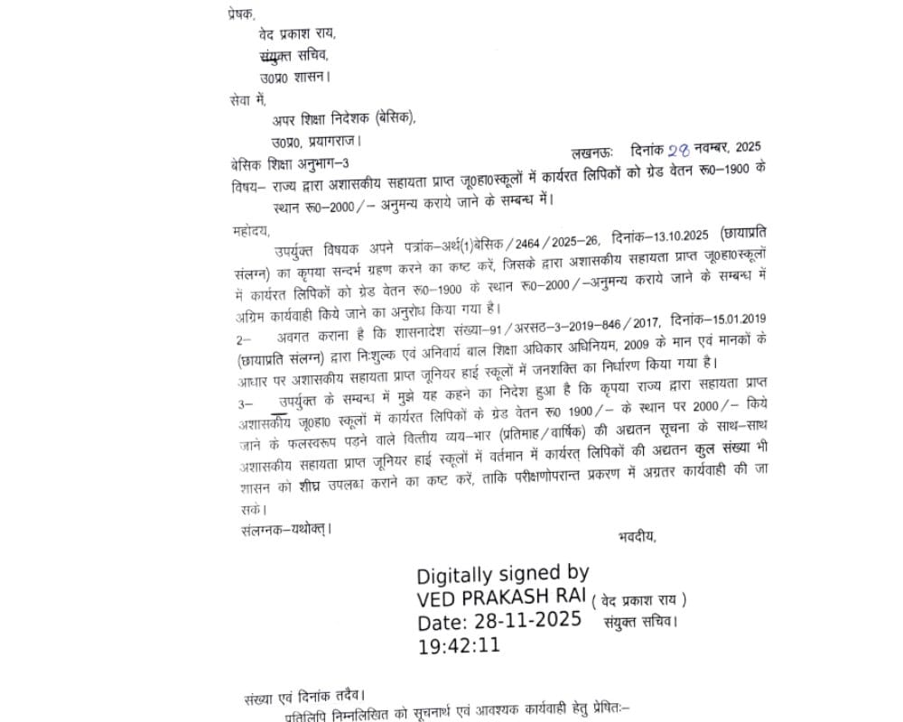 उत्तर प्रदेश में अशासकीय सहायता प्राप्त जूनिअर हाईस्कूलों में कार्यरत लिपिकों का ग्रेड पे बढ़ा दिया गया है। उनका ग्रेड पे 1900 से बढ़ाकर 2000 कर दिया गया है।