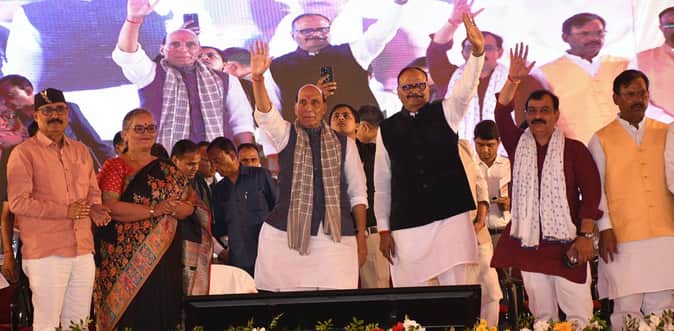 जनता का अभिवादन स्वीकार करते राजनाथ सिंह।