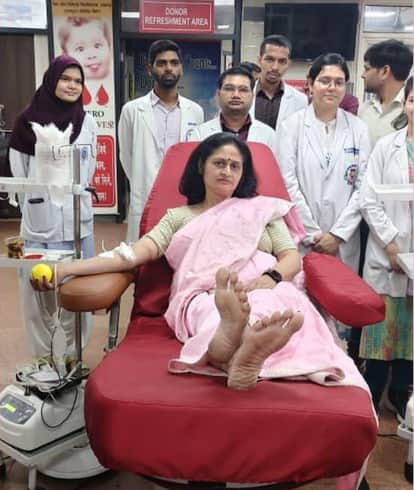 केजीएमयू में रक्तदान करतीं प्रो. तूलिका चंद्रा।