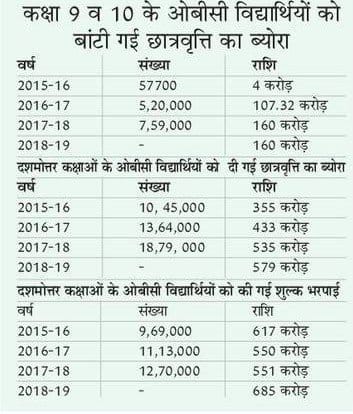 सरकार ने चालू वित्त वर्ष में प्रत्येक छात्र को वजीफा देने के निर्देश दिए हैं। वर्ष 2016-17 में सपा शासन में जहां कक्षा-9 व 10 के 5.20 लाख ओबीसी विद्यार्थियों को योजना का लाभ दिया गया था, वहीं पिछले वित्त वर्ष में इससे 2.39 लाख ज्यादा विद्यार्थियों को लाभ दिया गया।
