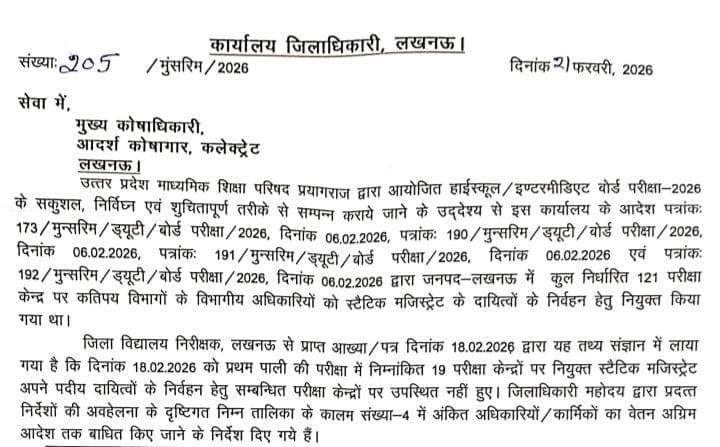 लखनऊ में यूपी बोर्ड परीक्षा ड्यूटी में लापरवाही मिलने पर 19 स्टैटिक मजिस्ट्रेट के खिलाफ कार्रवाई की गई। निरीक्षण में अनुपस्थित पाए जाने पर जिलाधिकारी ने उनका वेतन अगले आदेश तक रोक दिया। प्रशासन ने स्पष्ट किया कि परीक्षा जैसे संवेदनशील कार्य में लापरवाही किसी भी स्थिति में बर्दाश्त नहीं की जाएगी।