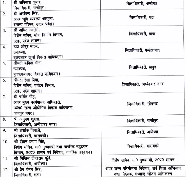 मुजफ्फरनगर विकास प्राधिकरण की उपाध्यक्ष कविता मीना को हापुड़ का डीएम, विशेष सचिव पर्यटन ईशा प्रिया को अम्बेडकरनगर का डीएम, यूपी राज्य औद्योगिक विकास प्राधिकरण कानपुर नगर के एसीईओ चर्चित गौड़ को सोनभद्र का डीएम, अम्बेडकरनगर के डीएम अनुपम शुक्ला को गाजीपुर का डीएम, बाराबंकी के डीएम शशांक त्रिपाठी को अयोध्या का डीएम, मुख्यमंत्री व नागरिक उड्डयन विभाग के विशेष सचिव और निदेशक नागरिक उड्डयन ईशान प्रताप सिंह को बाराबंकी का डीएम बनाया गया है।