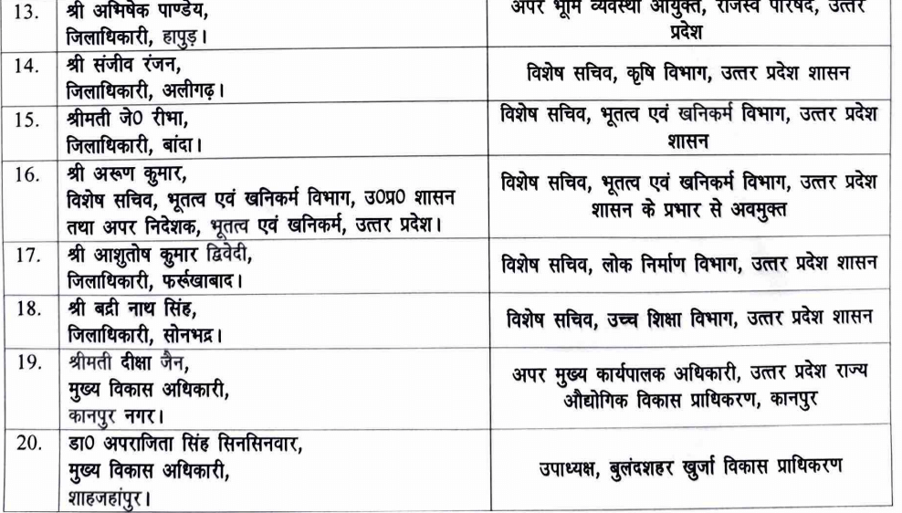 अयोध्या के डीएम निखिल टीकाराम फुंडे को सीएम का विशेष सचिव, एटा के डीएम प्रेम रंजन सिंह को अपर राज्य निदेशक, सर्व शिक्षा अभियान तथा निदेशक मध्यान्ह भोजन अभिकरण, हापुड़ के डीएम अभिषेक पांडेय को अपर भूमि व्यवस्था आयुक्त राजस्व परिषद, अलीगढ़ के डीएम संजीव रंजन को विशेष सचिव कृषि विभाग, बांदा की डीएम जे रीभा को विशेष सचिव भूतत्व एवं खनिकर्म बनाया गया है।