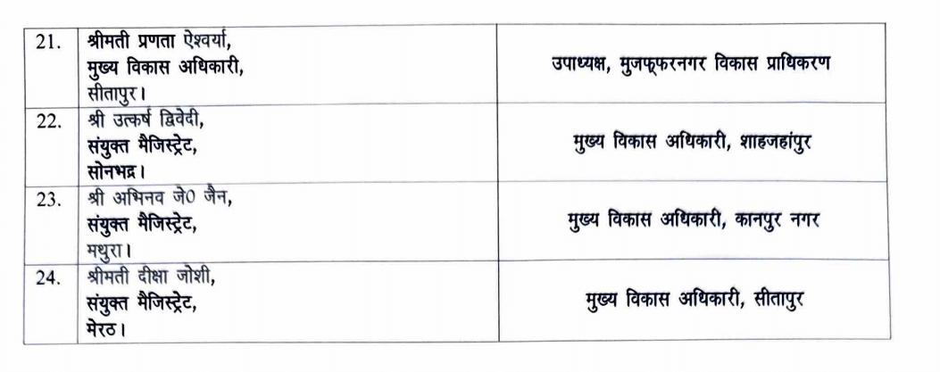 दीक्षा जैन सीडीओ कानपुर नगर से एसीईओ उत्तर प्रदेश राज्य औद्योगिक विकास प्राधिकरण कानपुर, डॉ. अपराजिता सिंह सिनसिनवार सीडीओ शाहजहांपुर से उपाध्यक्ष बुलंदशहर खुर्जा विकास प्राधिकरण, प्रणता ऐश्वर्या सीडीओ सीतापुर से उपाध्यक्ष मुजफ्फरनगर विकास प्राधिकरण, उत्कर्ष द्विवेदी संयुक्त मजिस्ट्रेट सोनभद्र को सीडीओ शाहजहांपुर, अभिनव जे जैन संयुक्त मजिस्ट्रेट मथुरा को सीडीओ कानपुर नगर और दीक्षा जोशी संयुक्त मजिस्ट्रेट मेरठ को सीडीओ सीतापुर बनाया गया है।