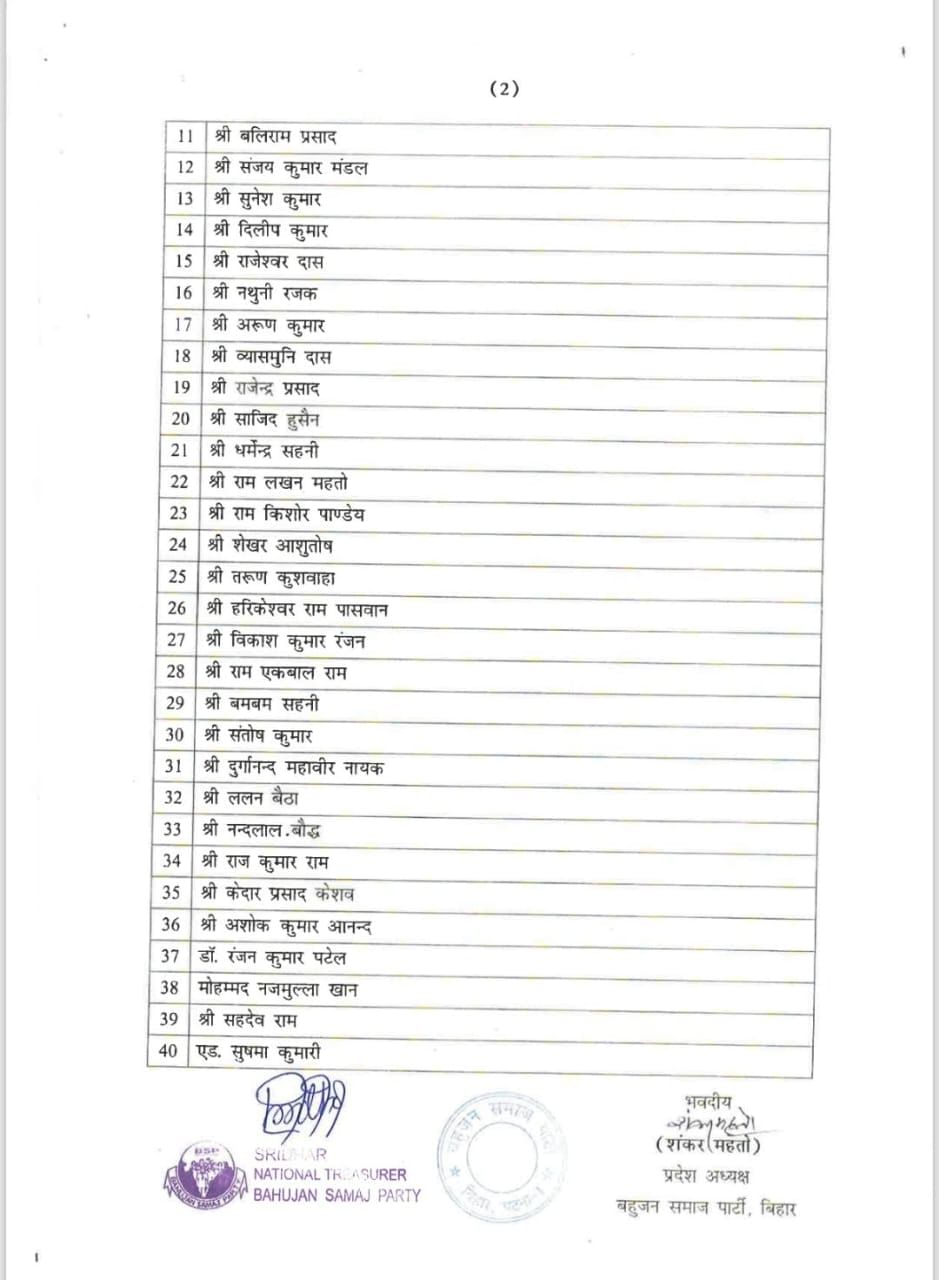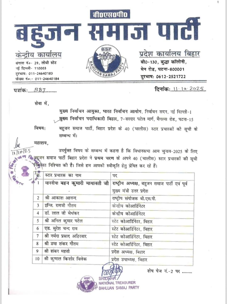 UP: बसपा ने बिहार विधानसभा चुनाव के लिए 88 प्रत्याशी घोषित किए, 40 स्टार प्रचारकों की सूची भी जारी की