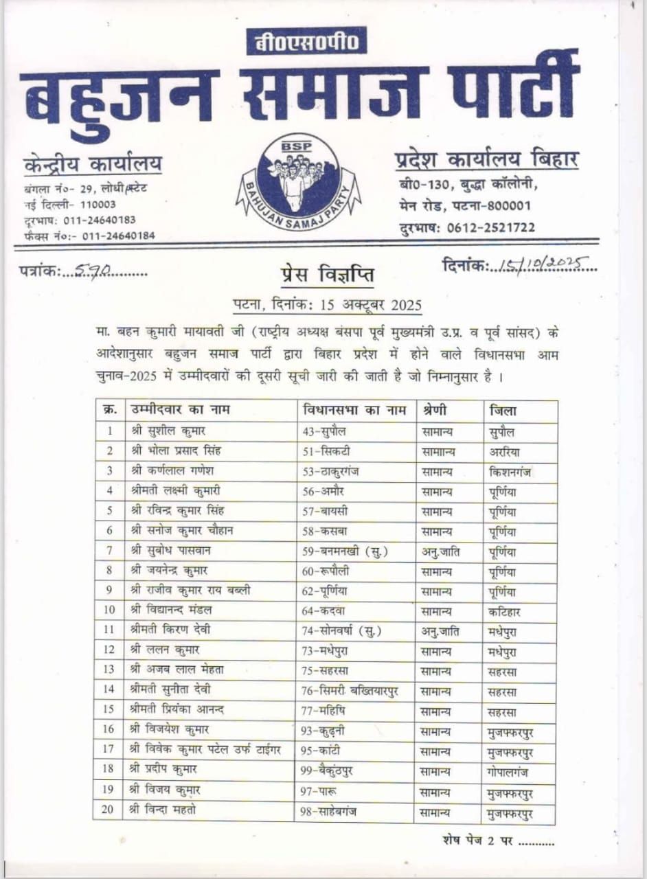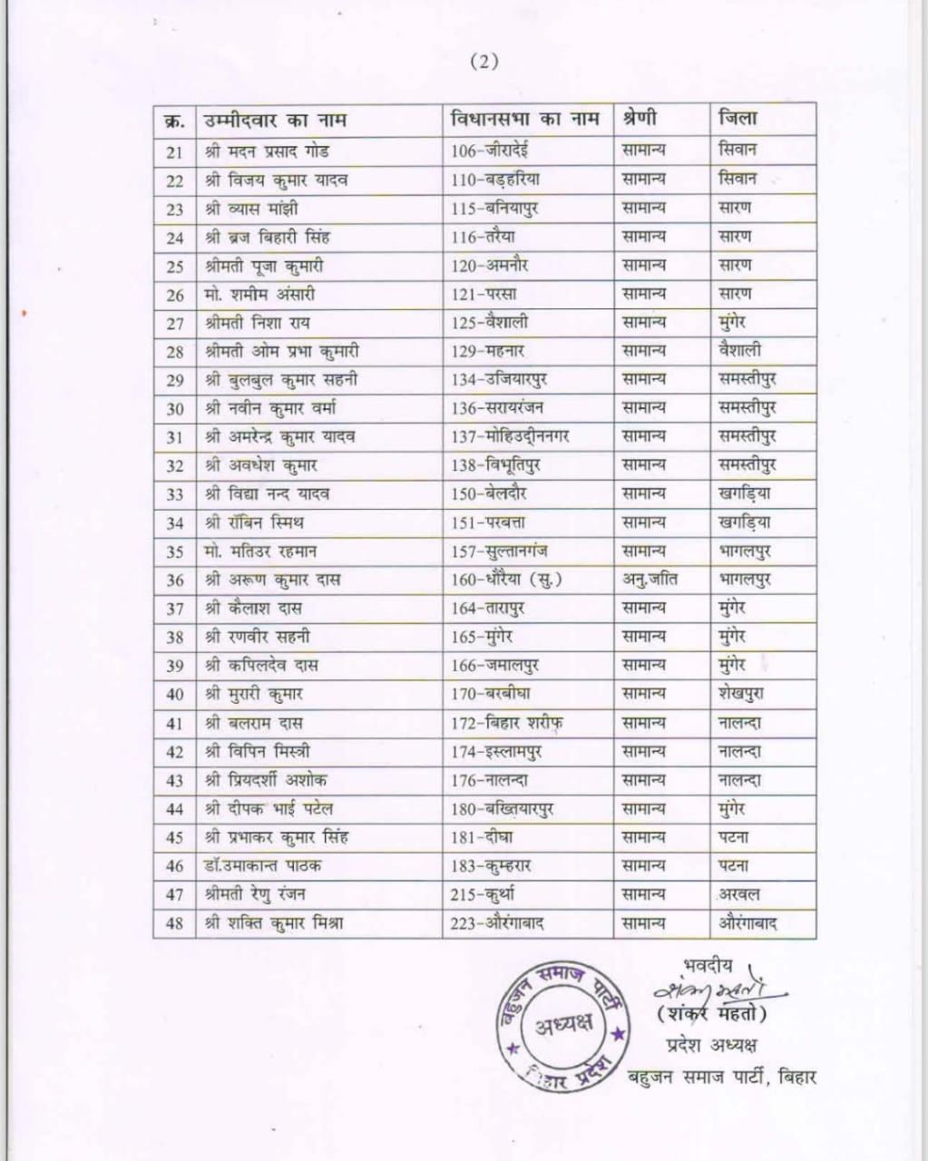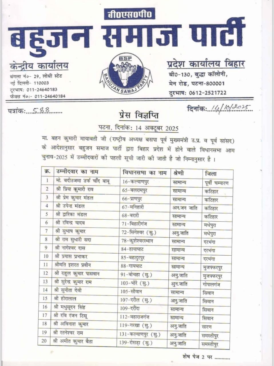बसपा ने बिहार विधानसभा चुनाव के 88 प्रत्याशियों की सूची जारी कर दी है। शुक्रवार को पहले चरण के नामांकन का अंतिम दिन है।