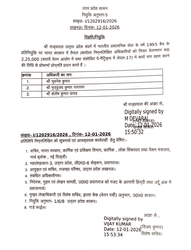 उत्तर प्रदेश सरकार ने बड़े प्रशासनिक फेरबदल में संजय प्रसाद, आशीष गोयल सहित वरिष्ठ IAS अधिकारियों को अपर मुख्य सचिव/प्रमुख सचिव के रूप में तैनात किया है।
