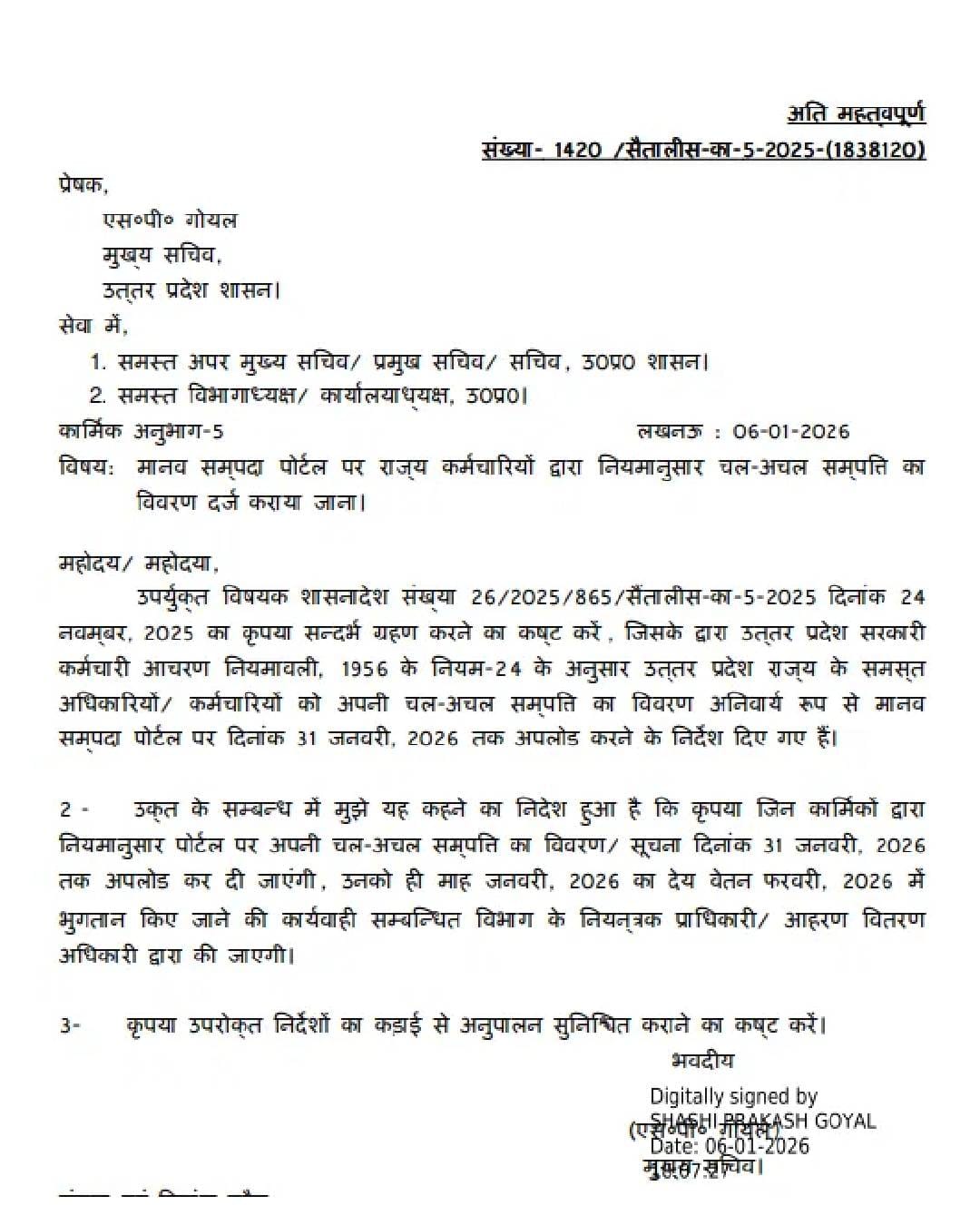 प्रदेश में आठ लाख से अधिक राज्य कर्मचारी हैं। आदेश में कहा गया था कि 31 दिसंबर 2025 तक अर्जित सभी चल-अचल संपत्तियों का ब्योरा 31 जनवरी 2026 तक पोर्टल पर ऑनलाइन देना होगा। अगर नहीं दिया तो फरवरी में जनवरी माह का वेतन नहीं मिलेगा।